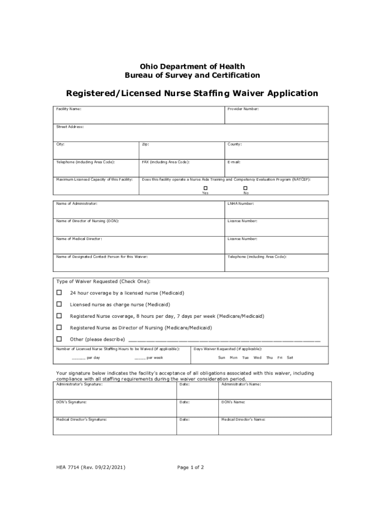 Ohio Department of Health Bureau of Survey and CertificationRegistered/Licensed Nurse Staffing Waiver Application Facility Name:Provider Number:Street Address:City:Zip:County:Telephone (including