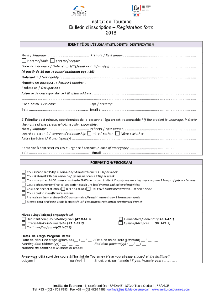 Get the free Institut de Touraine Bulletin Registration form 2018