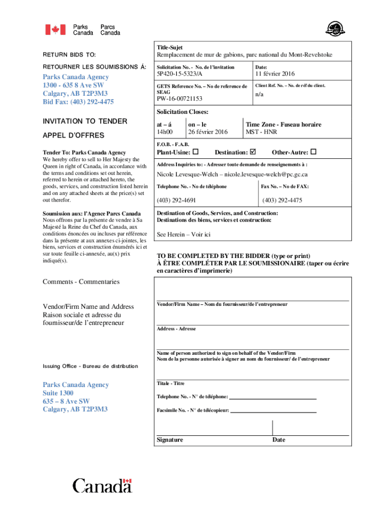 RETURN BIDS TO:TitleSujetRemplacement demur DE gabions, PARC national Du MontRevelstokeRETOURNER LES COMMISSIONS :Solicitation No. No. de linvitationDate:Parks Canada Agency 1300 635 8 Ave SW Calgary,