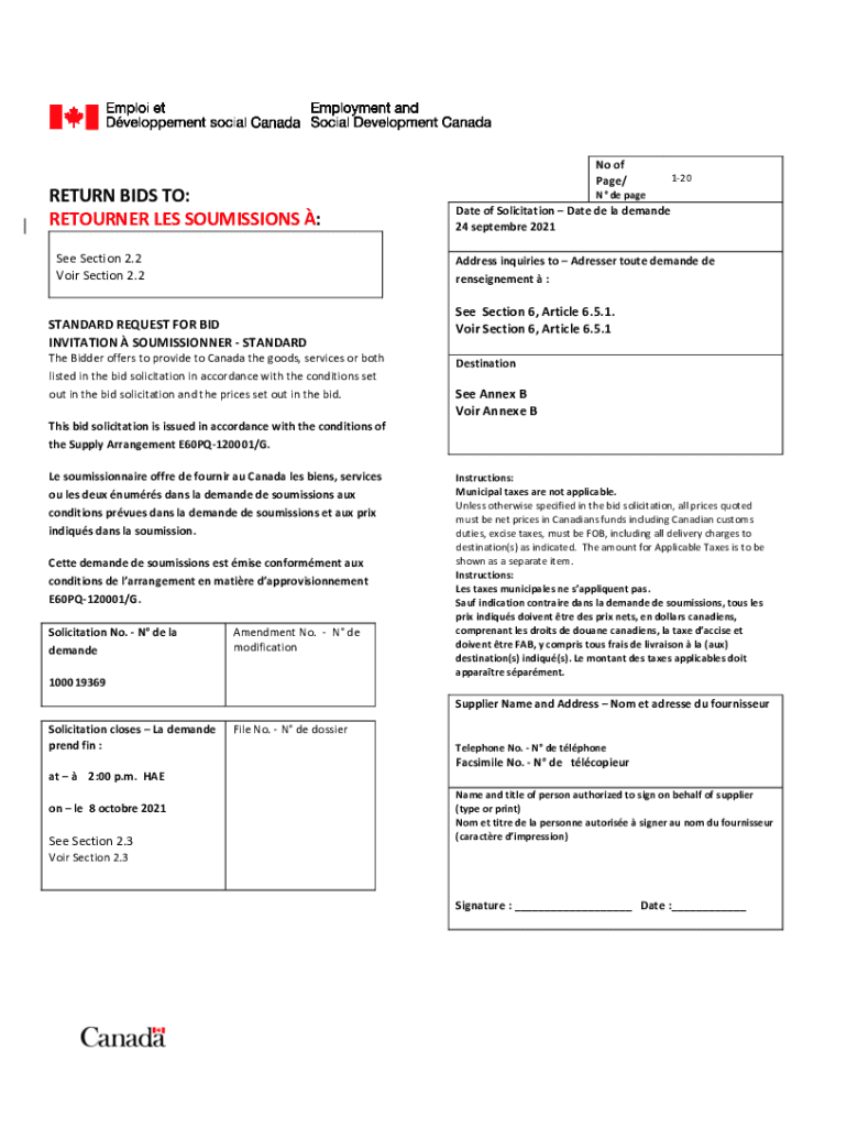 RETURN BIDS TO: RETURNER LES COMMISSIONS : See Section 2.2 Void Section 2.2No of Page/120 N de predate of Solicitation Date DE la demand 24 September 2021 Address inquiries to Dresser route demand