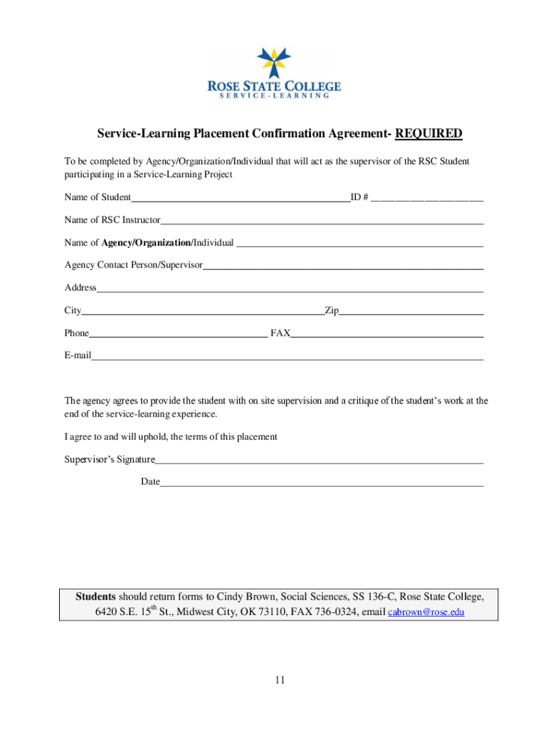 ServiceLearning Placement Confirmation Agreement REQUIRED To be completed by Agency/Organization/Individual that will act as the supervisor of the RSC Student participating in a ServiceLearning Project