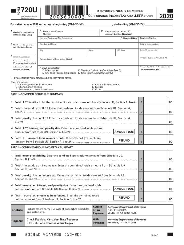 PACKAGE720UKentucky Unitary Combined Corporation Income Tax and LET Return and Instructions2020720U t Only use this package if you are required to file as a Unitary Combined Corporation Income Tax
