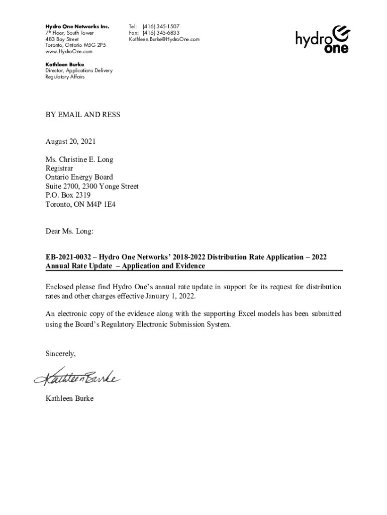 Hydro One Networks Inc.7th Floor, South Tower 483 Bay Street Toronto, Ontario M5G 2P5 www.HydroOne.comTel: (416) 3451507 Fax: (416) 3456833 Kathleen.Burke@HydroOne.comKathleen BurkeDirector, Applications