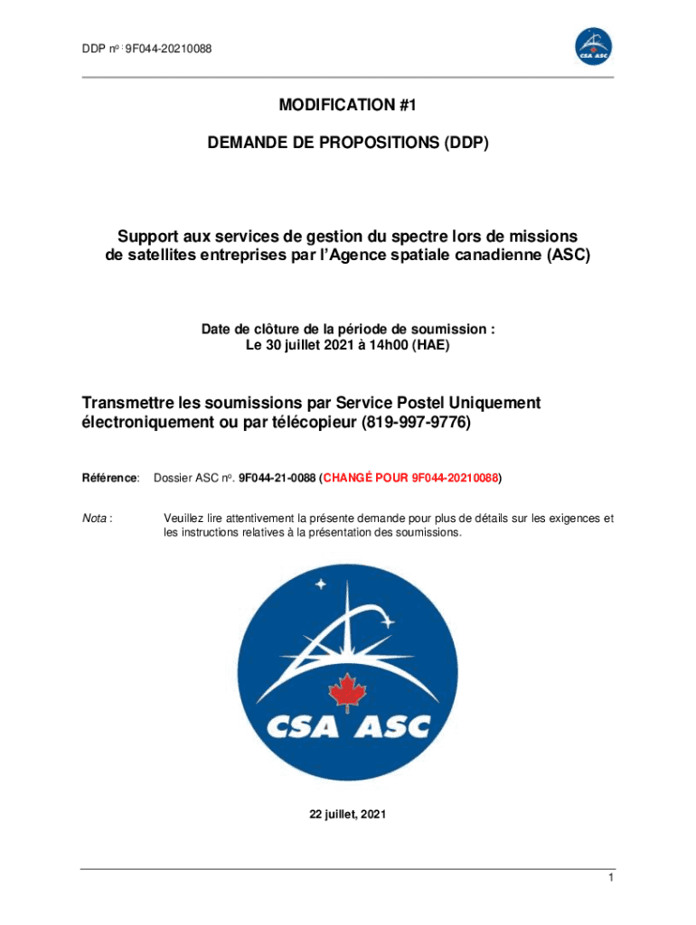 GDP no : 9F04420210088MODIFICATION #1 DEMAND DE PROPOSITIONS (GDP)Support aux services DE section Du specter loss DE missions DE satellites enterprises par agency spatial Canadian (ASC)Date DE culture