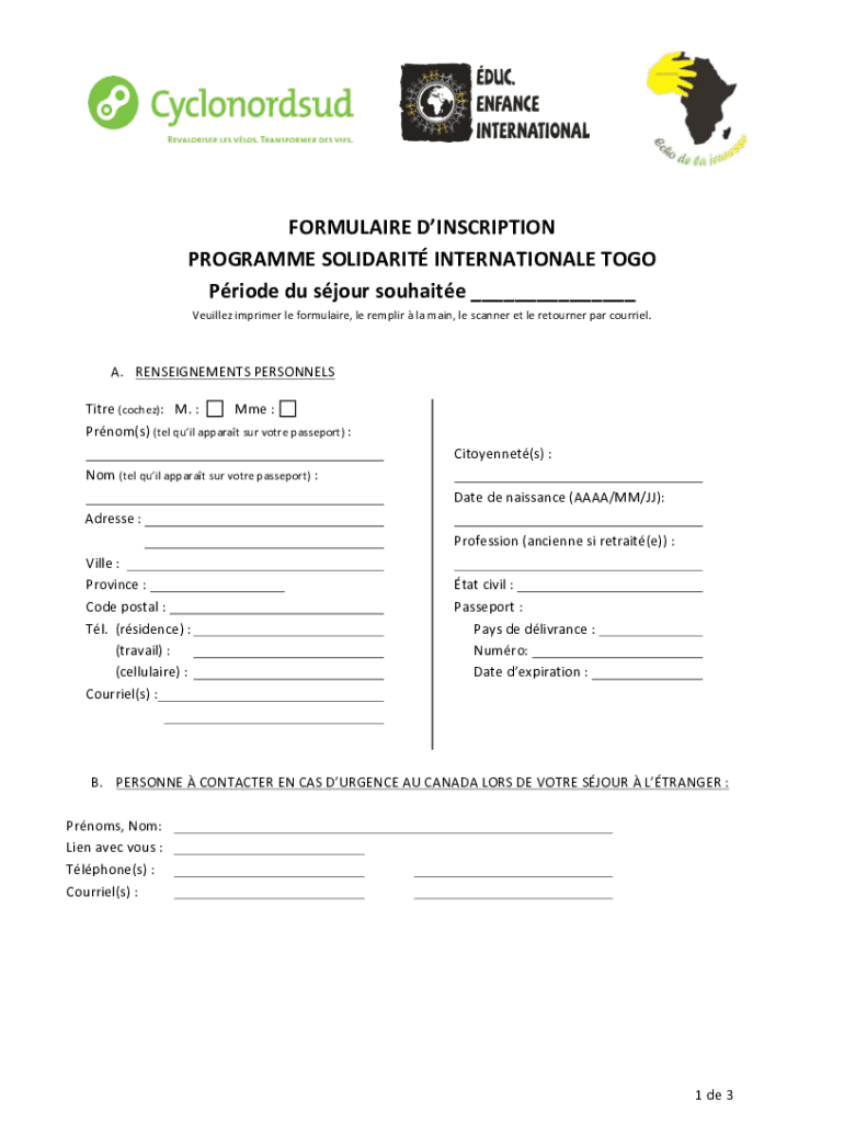FORMULA IRE DINSCRIPTIONPROGRAMME SOLIDARITY INTERNATIONALE TOGOPriode Du sour suite ___Vehicle improper LE formula ire, LE repair la main, LE scanner et LE returner par courier. A. REASSIGNMENTS