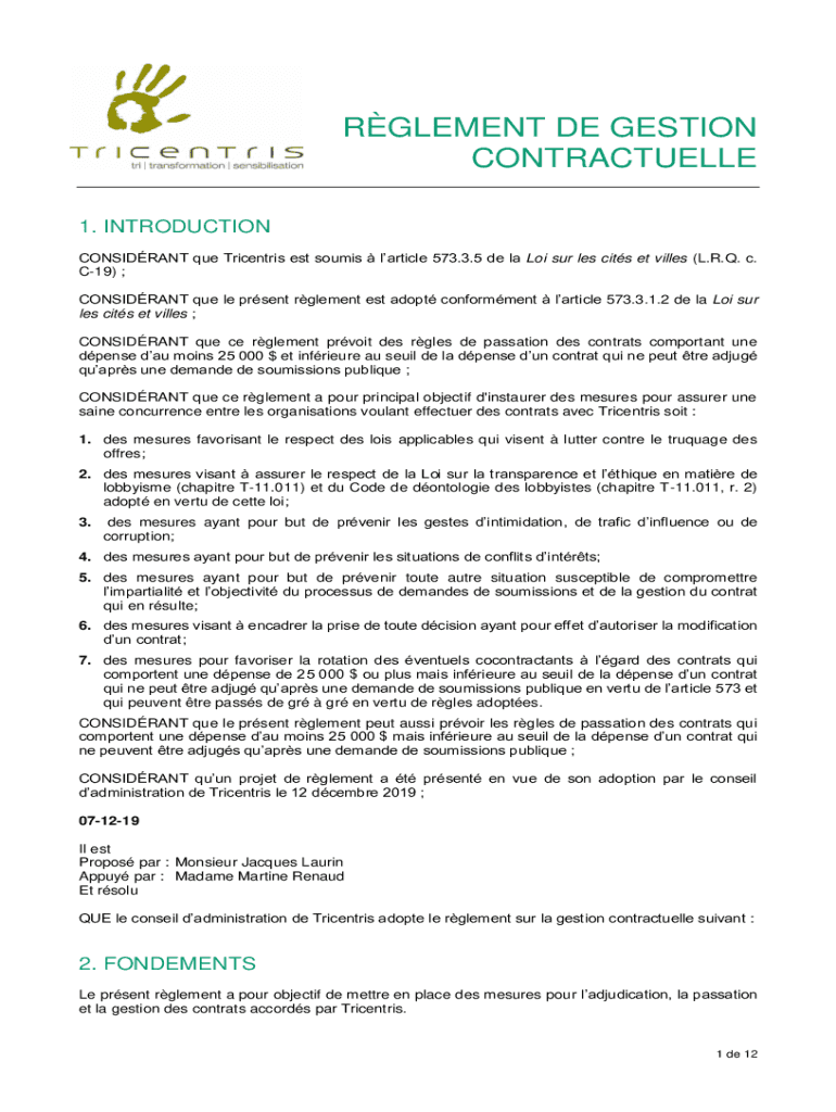 ELEMENT DE SECTION CONTRACTUALLY 1. INTRODUCTION CONFIDANT Que Tridents est Louis article 573.3.5 DE la LOI SUR LES cit set villas (L.R.Q. c. C19) ; CONFIDANT Que LE present element est adopt conferment