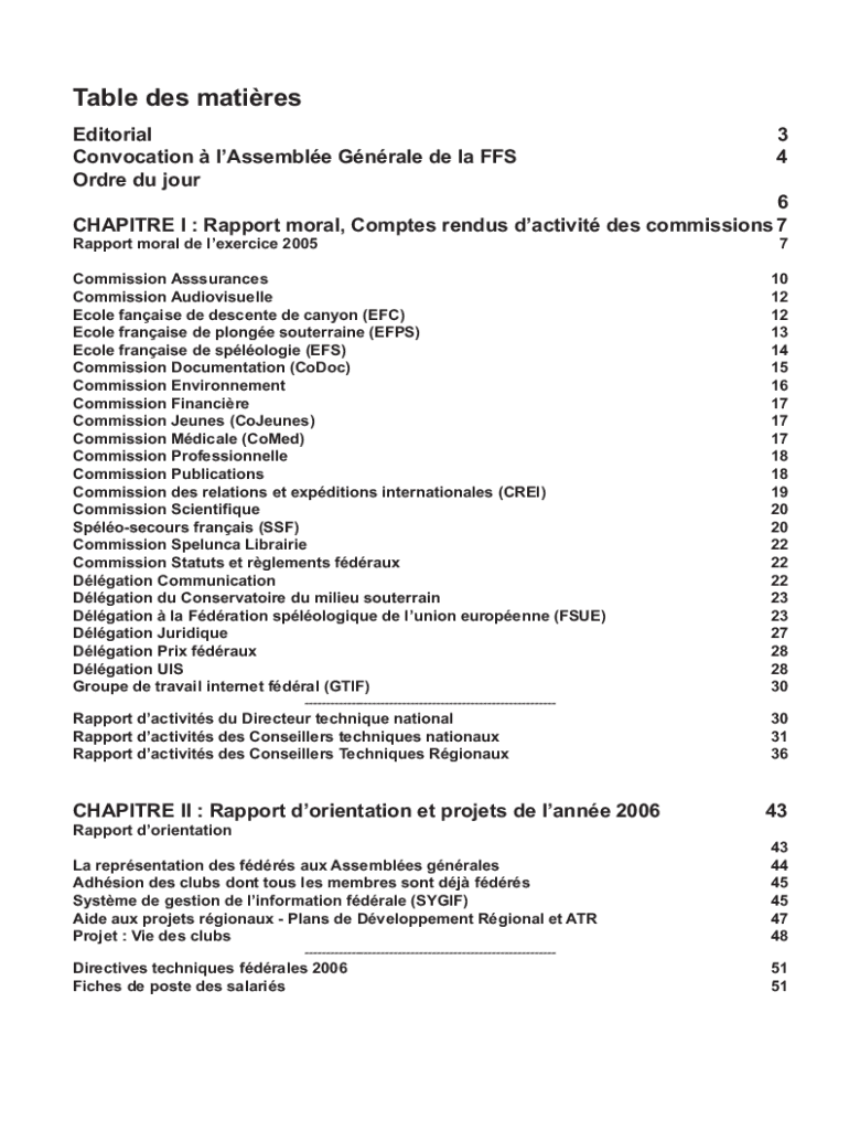 Table DES matures Editorial Convocation assemble GRALE de la FFS Order Du jour3 46 CHARITÉ I : Rapport moral, Competes rends activity DES commissions 7 Rapport moral DE exercise 2005 Commission Assurances