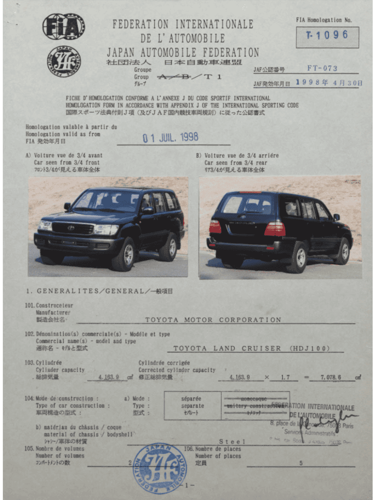 FIA Homologation No. FEDERATION INTERNATIONALE DE L A U T O M O B I L E JAPAN AUTOMOBILE FEDERATION f e t m y v Group n1T1 0 9 6 FT073JAF^SJl^^ B199 8if4f330aFICHE HOMOLOGATION CONFORM A ANNEXED J