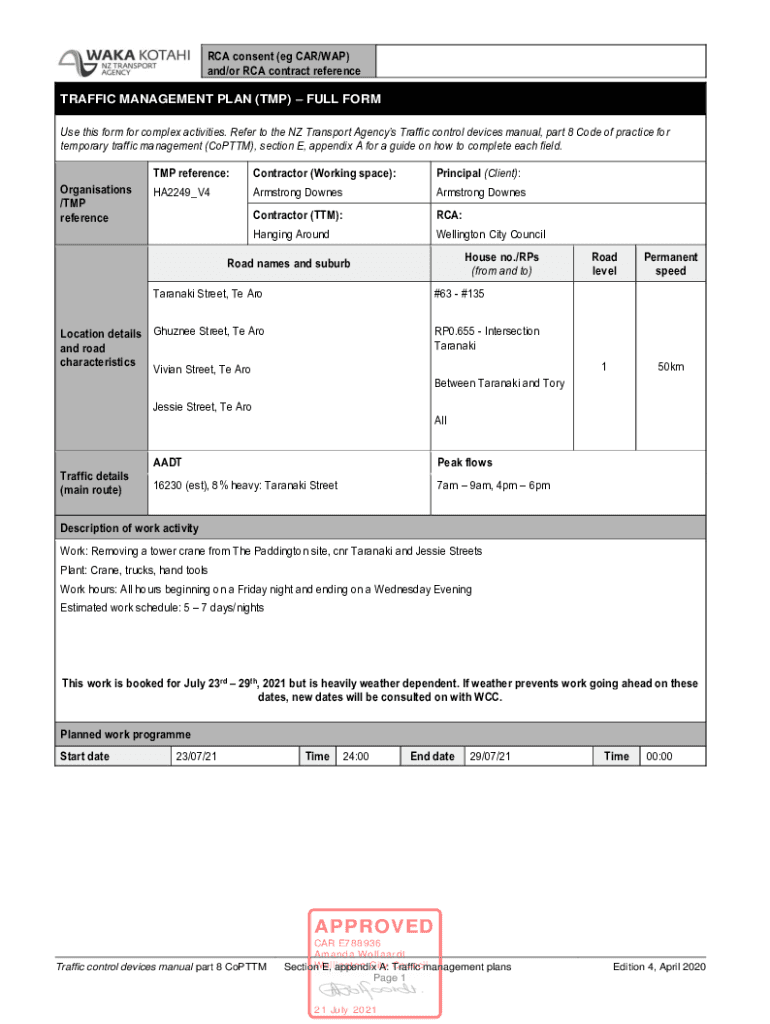 RCA consent (e.g. CAR/WAP) and/or RCA contract reference TRAFFIC MANAGEMENT PLAN (TMP) FULL FORM Use this form for complex activities. Refer to the NZ Transport Agencies Traffic control devices manual,