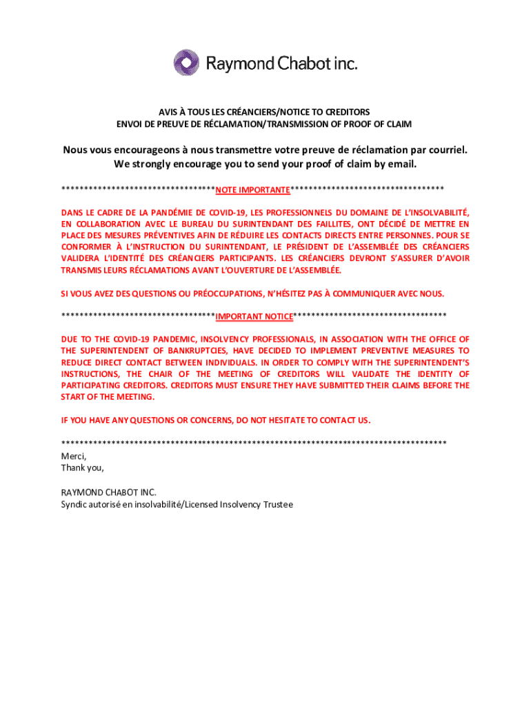 AVIS THUS LES CANCERS/NOTICE TO CREDITORS ENVOY DE PROVE DE RECLAMATION/TRANSMISSION OF PROOF OF Claims vows encourages nous transmitter vote prove DE reclamation par courier. We strongly encourage