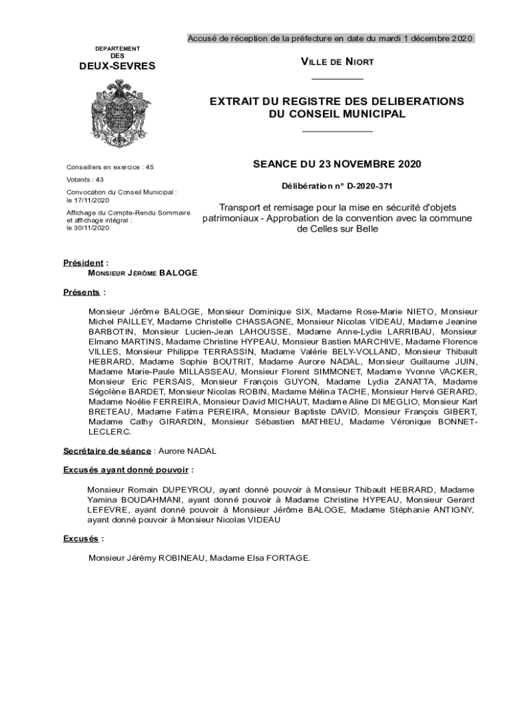 Accuse DE reception DE la prefecture en date Du Mari 1 December 2020 DEPARTEMENTDESVILLE DE NI ORT ___Deux-Sèvres ___EXTRACT DU REGISTRY DES DELIBERATIONS DU CONSENT MUNICIPAL ___ Séance DU 23 NOVEMBER