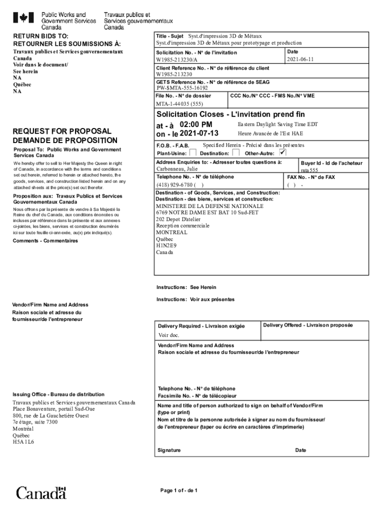 1 1RETURN BIDS TO: RETURNER LES COMMISSIONS :Title Suet SST’d\'impression 3D de MtauxTravaux public set Services gouvernementaux Canada Void days LE document/ See herein NA Quebec Solicitation No.