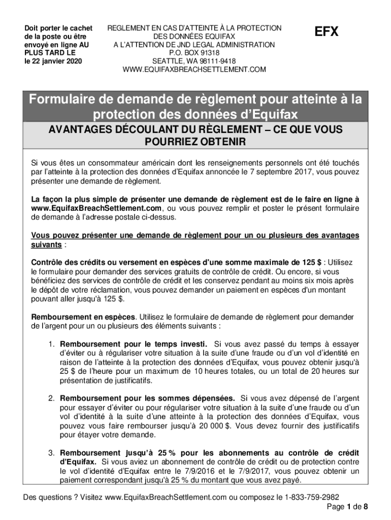 Dot porter LE cachet DE la post outré envoy en line AU PLUS TARD LE 22 Janvier 2020REGLEMENT EN CAS Datelines LA PROTECTION DES DONNÉS EQUIFAX A ATTENTION DE AND LEGAL ADMINISTRATION P.O. BOX 91318