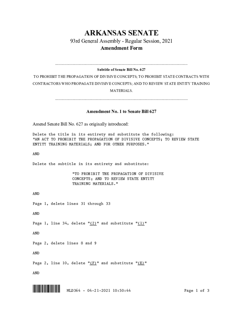 ARKANSAS SENATE 93rd General Assembly Regular Session, 2021 Amendment Form ___ Subtitle of Senate Bill No. 627 TO PROHIBIT THE PROPAGATION OF DIVISIVE CONCEPTS; TO PROHIBIT STATE CONTRACTS WITH CONTRACTORS