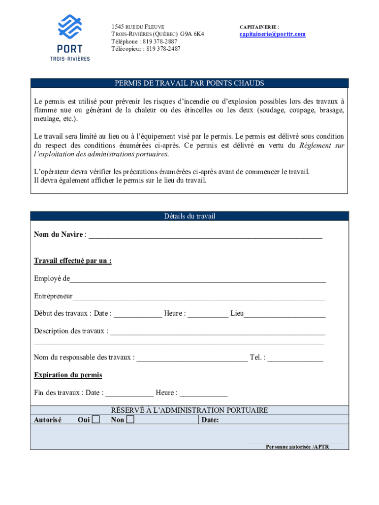 1545 RUE DU LEAVE Trois-Rivières (QUEBEC) G9A 6K4 Tl phone : 819 3782887 Copiers : 819 3782487CAPITAINERIE :capitainerie@porttr.compares DE TRAVAIL PAR POINTS CHADS Le permit est utility pour prevent