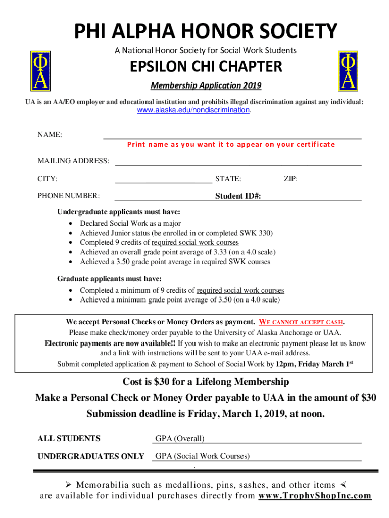 PHI ALPHA HONOR SOCIETY A National Honor Society for Social Work StudentsEPSILON CHI CHAPTER Membership Application 2019 UA is an AA/EO employer and educational institution and prohibits illegal discrimination