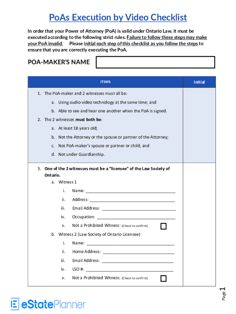 Pas Execution by Video Checklist In order that your Power of Attorney (POA) is valid under Ontario Law, it must be executed according to the following strict rules. Failure to follow these steps may
