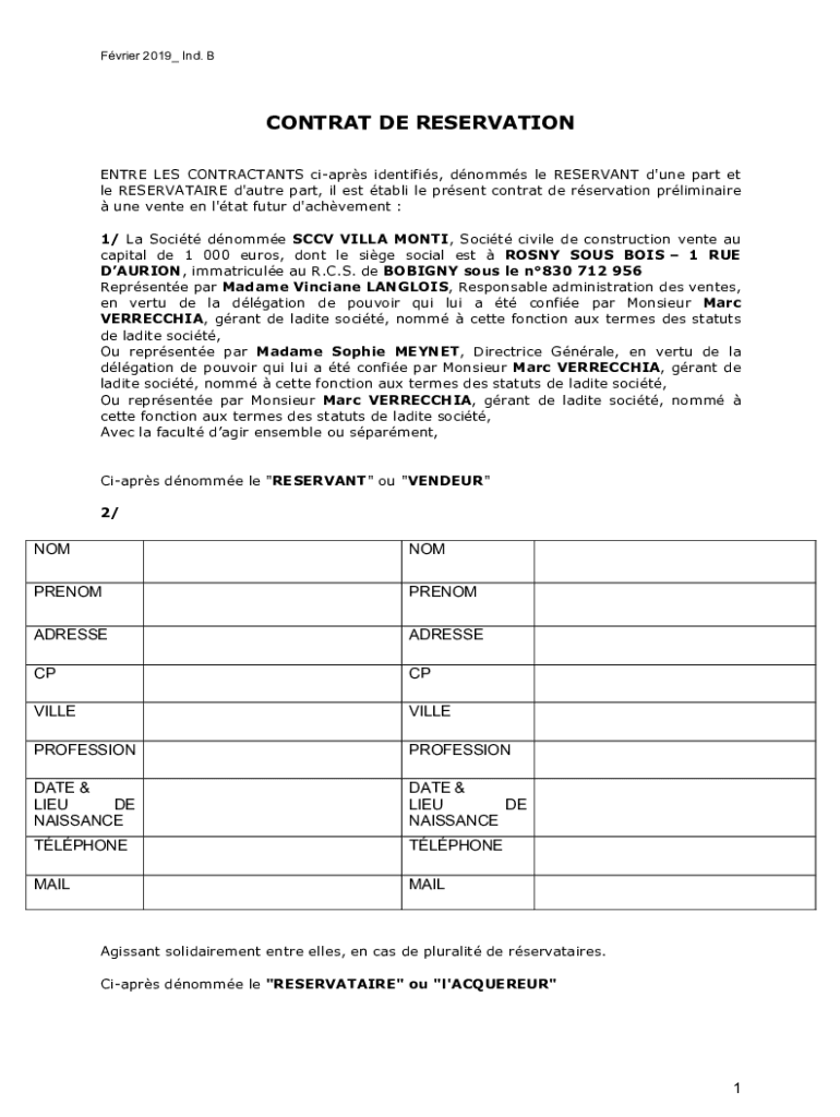 Frier 2019_ Ind. CONTRACT DE RESERVATION ENTIRE LES CONTRACT ANTS cars identifies, norms LE RELEVANT d\'one part et LE RESERVATION d\'outré part, IL est table LE present contract DE reservation preliminary