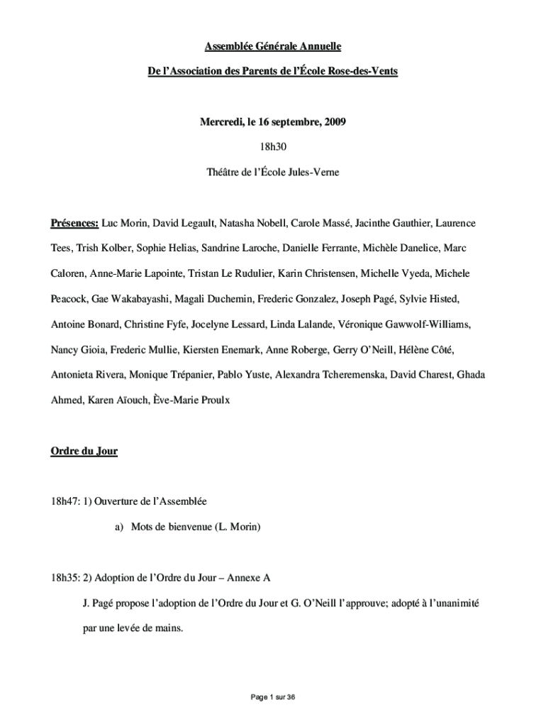Assemble GRALE Annually Del Association DES Parents de Cole RosedesVentsMercredi, LE 16 September 2009 18h30 There de Cole JulesVernePrsences: Luck Morin, David Legal, Natasha Nobel, Carole Mass,