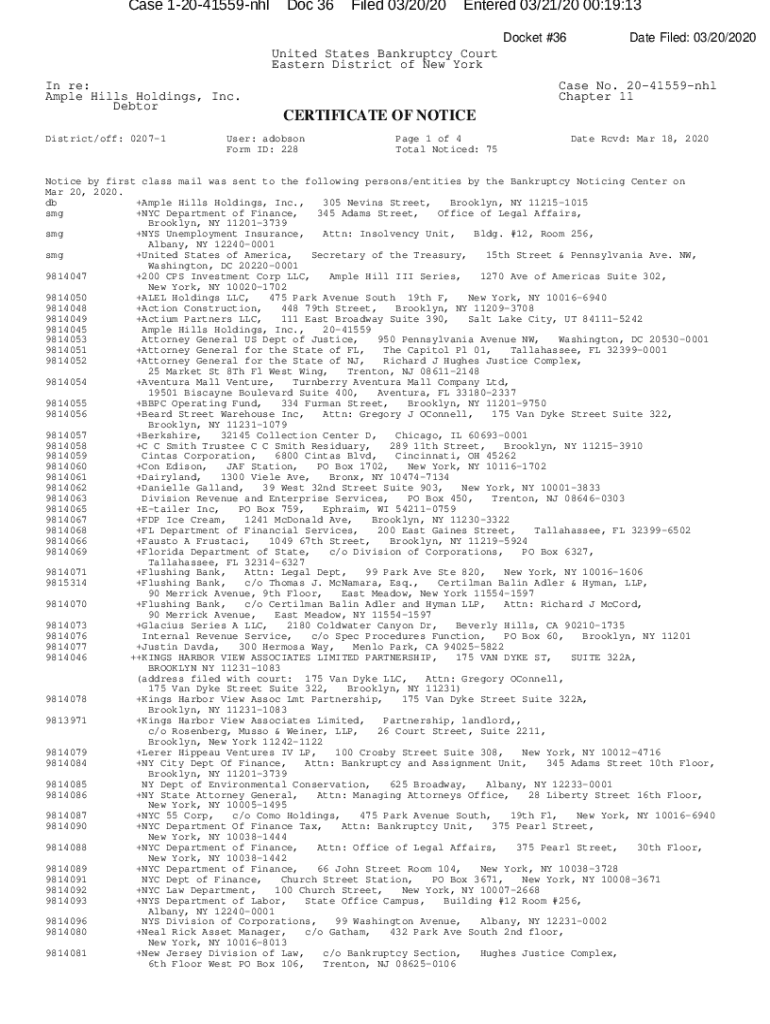 Case 12041559nhlDoc 36Filed 03/20/20Entered 03/21/20 00:19:13 Docket #36Date Filed: 03/20/2020United States Bankruptcy Court Eastern District of New York In re: Ample Hills Holdings, Inc. Debtor District/off: