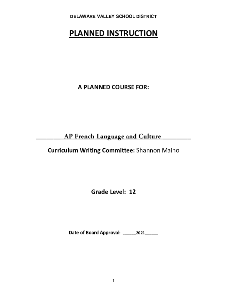 DELAWARE VALLEY SCHOOL DISTRICTPLANNED INSTRUCTION PLANNED COURSE FOR:___ AP French Language and Culture ___ Curriculum Writing Committee: Shannon Mainframe Level: 12Date of Board Approval: ___2021___1DELAWARE