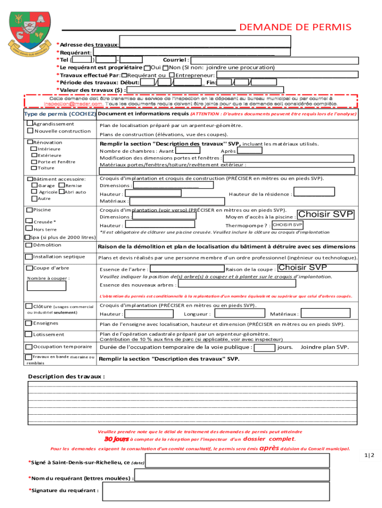 DEMAND DE PERMIT *Address DES travail:___ ___ *Return: ___ *Tel (___) ______ Courier : *Le return est proprietary OUI Non (SI non: joiner one procreation) *Travail effect Par:Return of Entrepreneur: