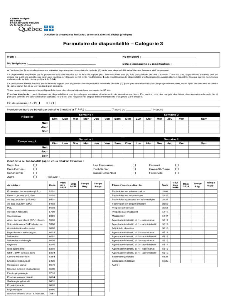 Direction DES resources humans, communication set affairs juridiquesFormulaire de disponibilit Categories 3 Not : ___No employ : ___No phone : ___Date debauched of modification : ___ Limbaugh, la