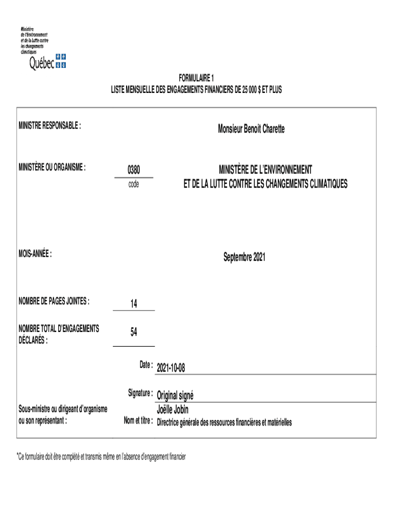 FORMULA IRE 1 LIST ESTELLE DES ENGAGEMENTS FINANCIERS DE $25000 ET PLUSMINISTRE RESPONSIBLE :MINISTRY OF ORGANISM :Monsieur Benoit Charette0380 codeMINISTRE DE ENVIRONMENT ET DE LA LUTE CONTRA LES