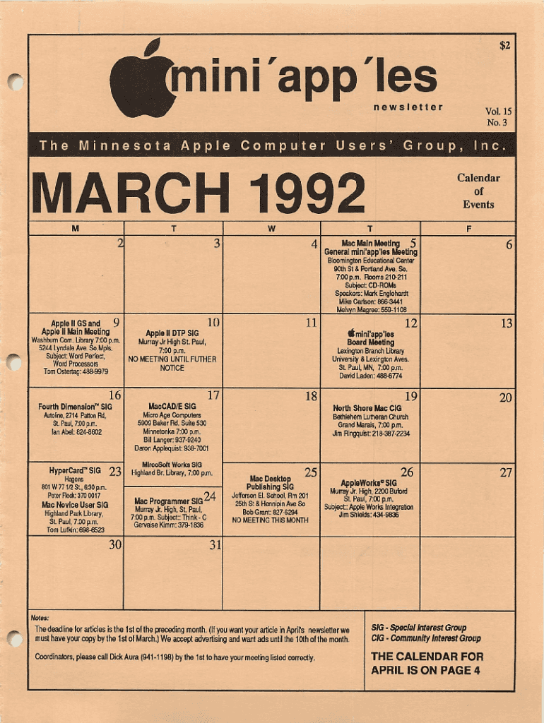 $02mini\'app\'LES ^TheyMinnesotanewsletterAppleComputerUsers\'MARCH 1992 MwT234vd15 No.3Group,Inc.FT Mac Main Meeting 5 General mini\'app\'LES Meeting6Bloomington Educational Center 90th St & Portland