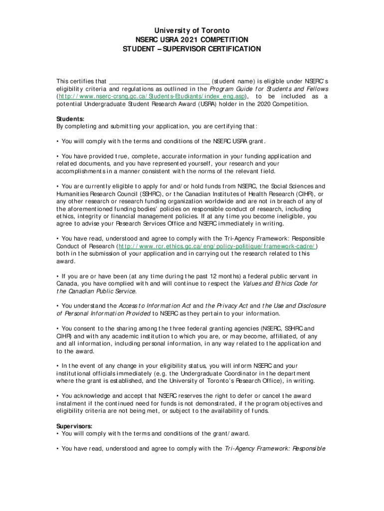 University of Toronto NS ERC USA 2021 COMPETITION STUDENT SUPERVISOR Certifications certifies that ___ ___ (student name) is eligible under Users' eligibility criteria and regulations as outlined
