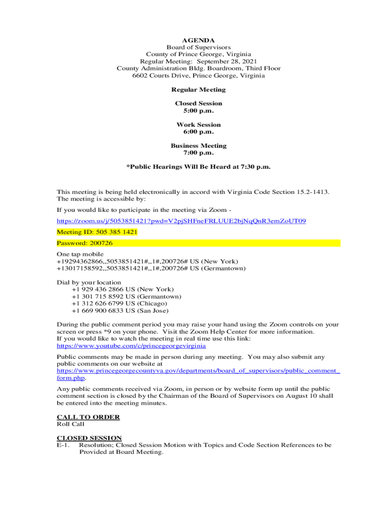 AGENDA Board of Supervisors County of Prince George, Virginia Regular Meeting: September 28, 2022, County Administration Bldg. Boardroom, Third Floor 6602 Courts Drive, Prince George, Virginia Regular