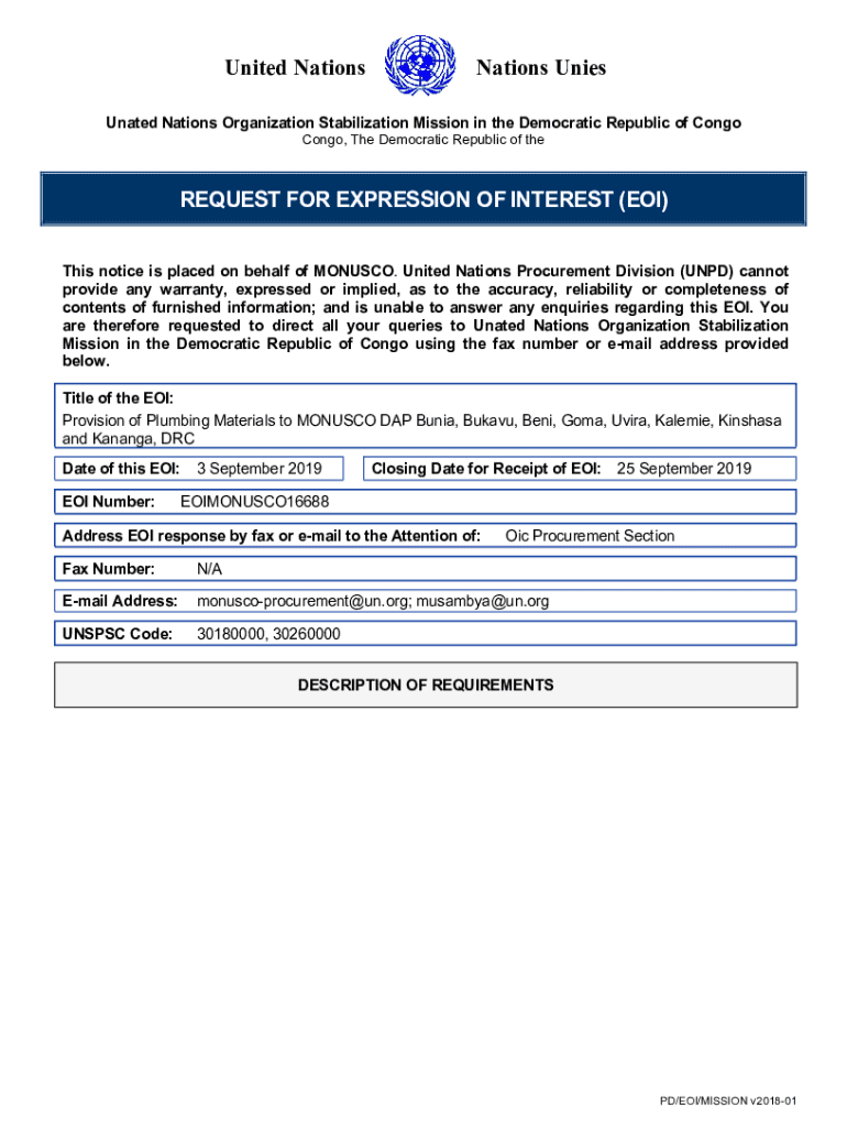 United NationsNations Uninsulated Nations Organization Stabilization Mission in the Democratic Republic of Congo, The Democratic Republic of request FOR EXPRESSION OF INTEREST (EOI) This notice is
