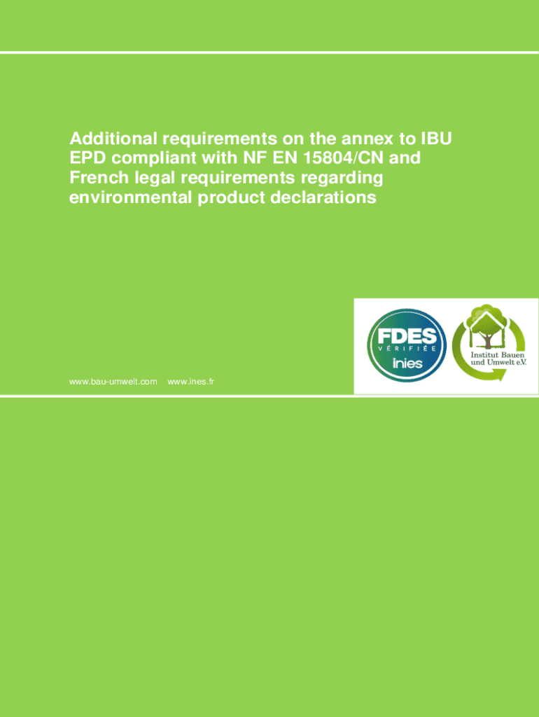 Additional requirements on the annex to IBM END compliant with NF EN 15804/CN and French legal requirements regarding environmental product declarations.bauumwelt.come.ins.imprint:Publisher: Institute