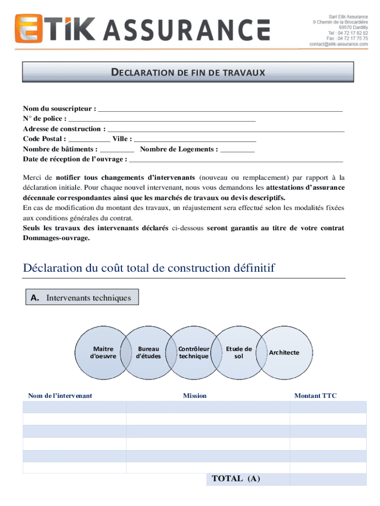 1DECLARATION DE FIN DE TRAVAIL Not Du souscripteur : ___ N de police : ___ Address DE construction : ___ Code Postal : ___ Villa : ___ Hombre DE aliments : ___ Hombre de Logements : ___ Date DE reception