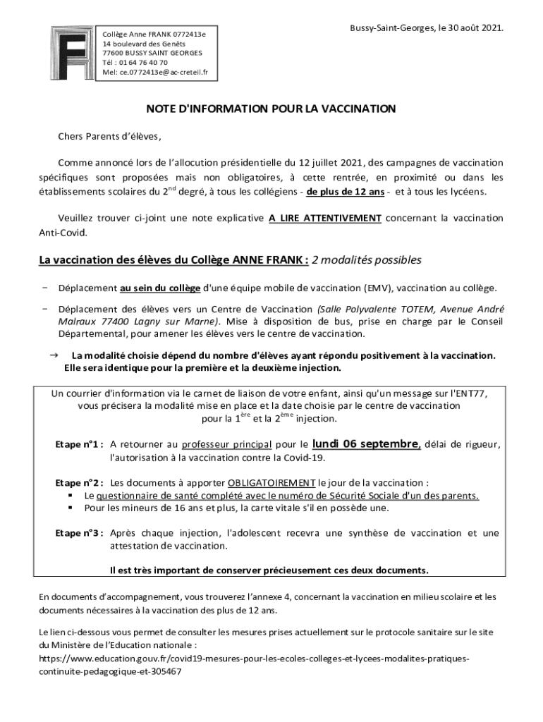 College Anne Frank 0772413e 14 boulevard DES Gents 77600 BUSY SAINT GEORGES Tl : 01 64 76 40 70 Mel: ce.0772413e@accreteil.frBussySaintGeorges, LE 30 AOT 2021.NOTE D\'INFORMATION POUR LA VACCINATION