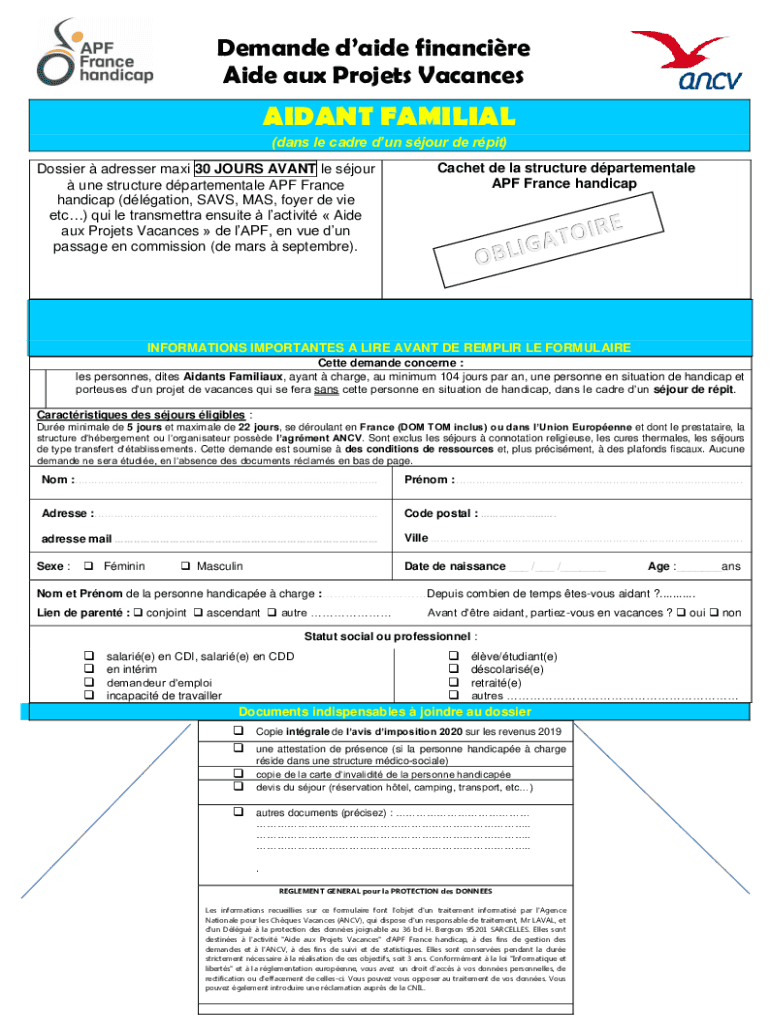 Demanded aide financier Aide aux Projects VacancesAIDANT FAMILIAL (days LE cadre don't sour DE pit) Dossier dresser maxi 30 HOURS SAVANT LE sour one structure departmental APF France handicap (duration,