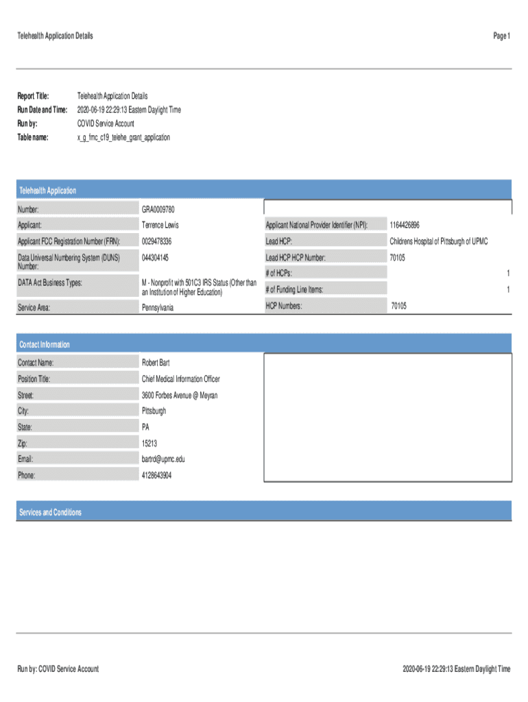 Telehealth Application DetailsReport Title: Run Date and Time: Run by: Table name:Page 1Telehealth Application Details 20200619 22:29:13 Eastern Daylight Time COVID-19 Service Account x_g_FMC_c19_telehe_grant_applicationTelehealth