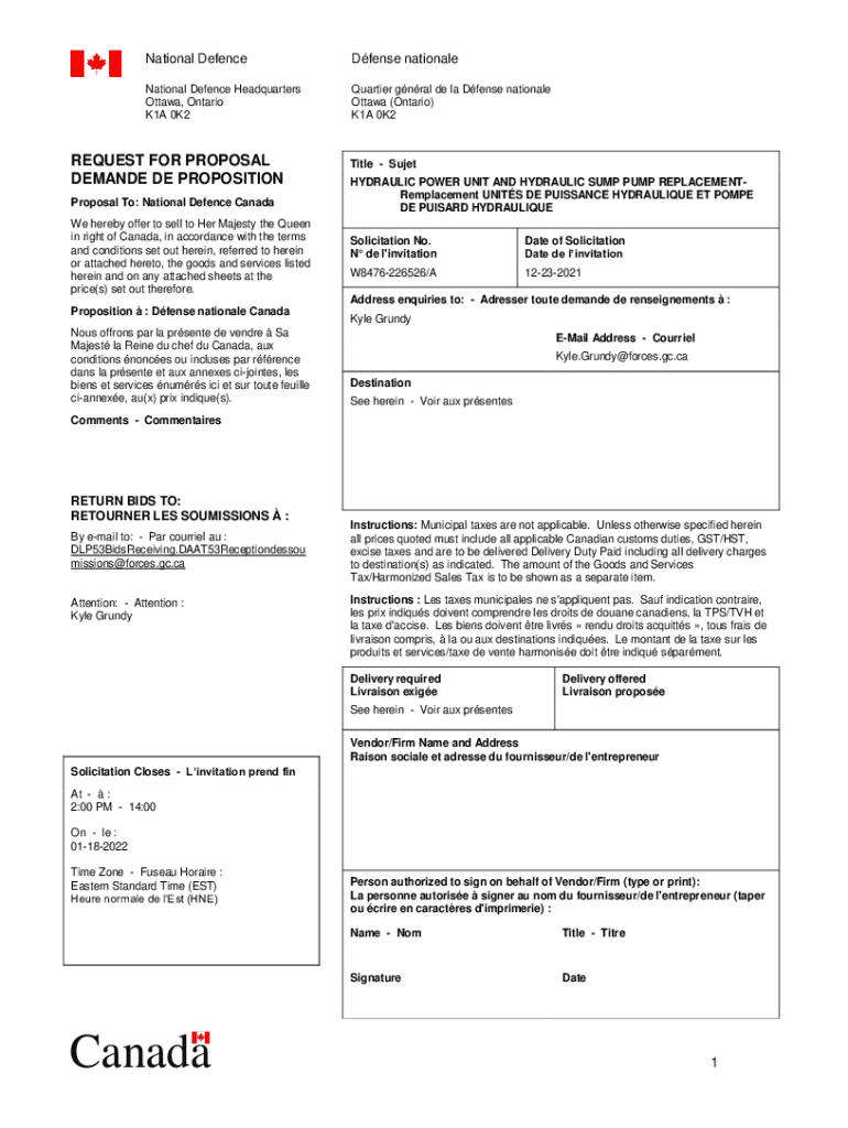 National DefenceDfense nationaleNational Defense Headquarters Ottawa, Ontario K1A 0K2Quartier gnarl DE la Defense national Ottawa (Ontario) K1A 0K2REQUEST FOR PROPOSAL DEMAND DE PROPOSITION Proposal