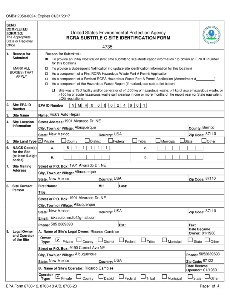 OMB# 20500024; Expires 01/31/2017 SEND COMPLETED FORM TO: The Appropriate State or Regional Office. 1. United States Environmental Protection Agency CRA SUBTITLE C SITE IDENTIFICATION FORM 4735Reason