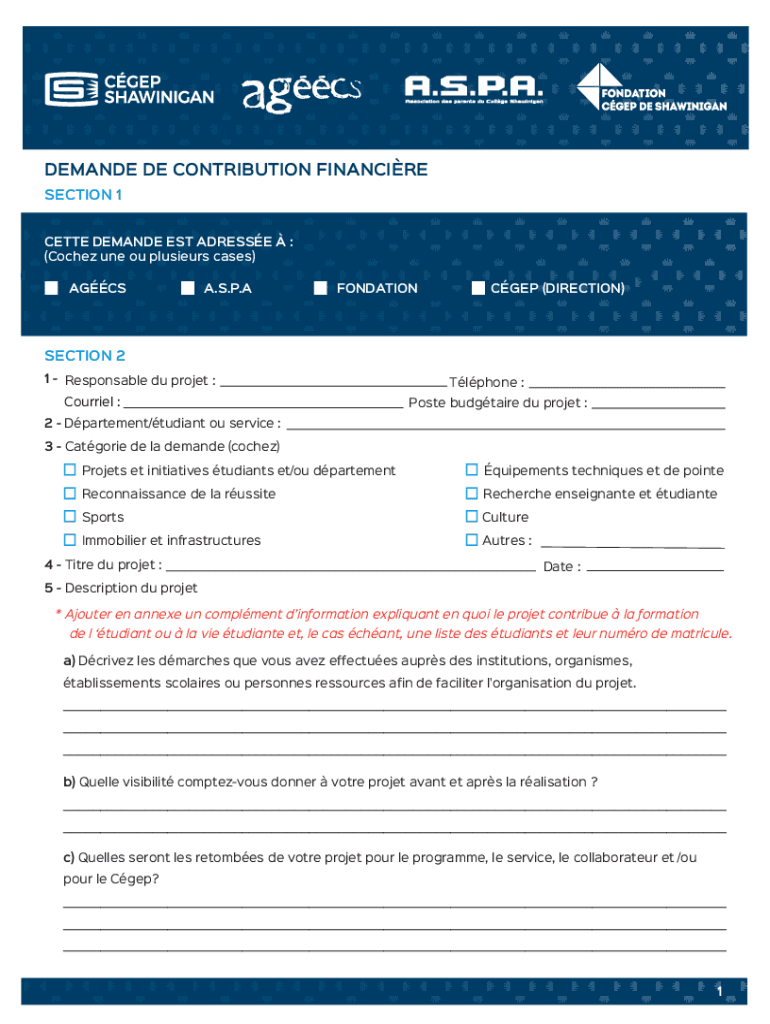 Any individual, organization, or project seeking financial assistance can use a demande de contribution financire form.
