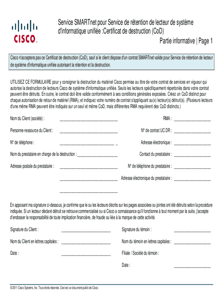Service SMART net pour Service de retention DE letter DE system d\'informative unified :Certificate DE destruction (Cod) Parties informative | Page 1 Cisco n\'accept era pas CE Certificate de destruction
