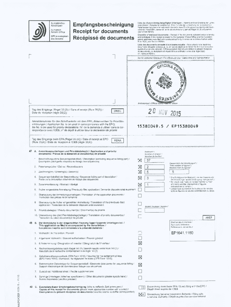 Euro pie SC he s Pa the name Eur o mean Pa tent Office European de s brevetsEmpfangsbescheinigung Receipt for documents Rapids DE documents 1 D ate of receipt (Rule 35(2)) 1Anmeldenummer for d en