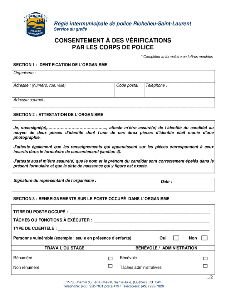 GIE intermunicipale de police RichelieuSaintLaurent Service Du greffeCONSENTEMENT DES VERIFICATIONS PAR LES CORPS DE POLICE * Computer LE formula ire en letters moulesSECTION 1 : IDENTIFICATION DE