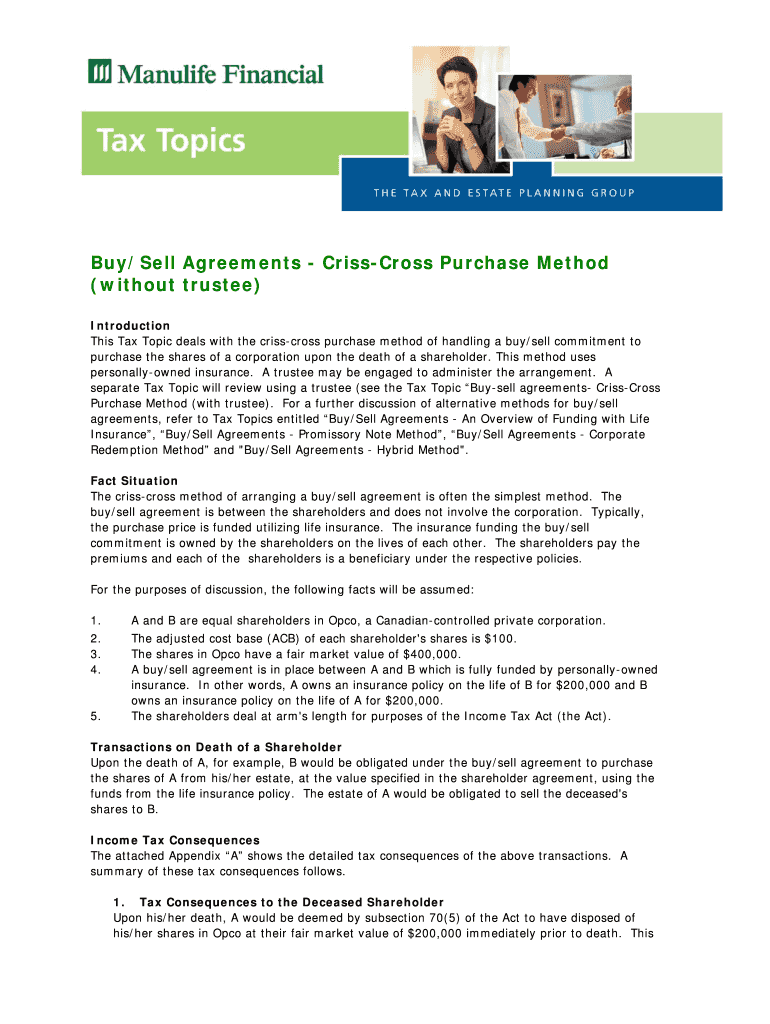 1Buy/Sell Agreements Crisscross Purchase Method (without trustee) Introduction This Tax Topic deals with the crisscross purchase method of handling a buy/sell commitment to purchase the shares of