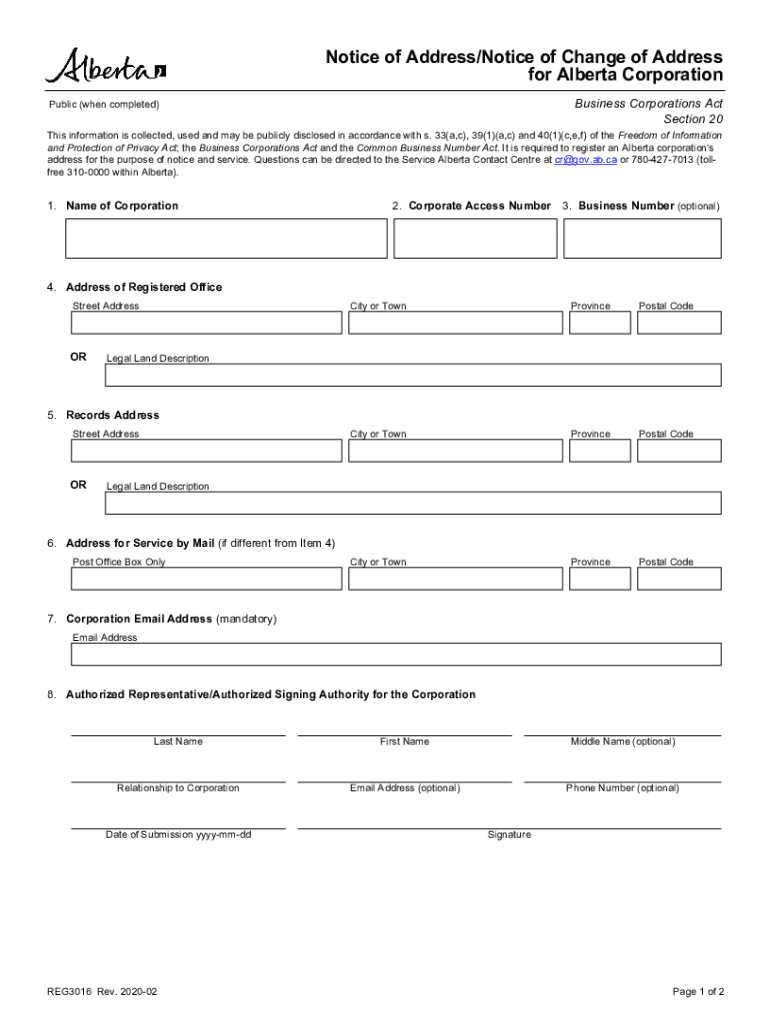 Notice of Address/Notice of Change of Address for Alberta Corporation Business Corporations Act Section 20Public (when completed)This information is collected, used and may be publicly disclosed in