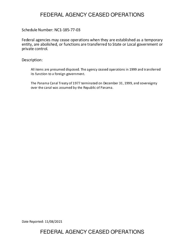 FEDERAL AGENCY CEASED OPERATIONS Schedule Number: NC11857703 Federal agencies may cease operations when they are established as a temporary entity, are abolished, or functions are transferred to State
