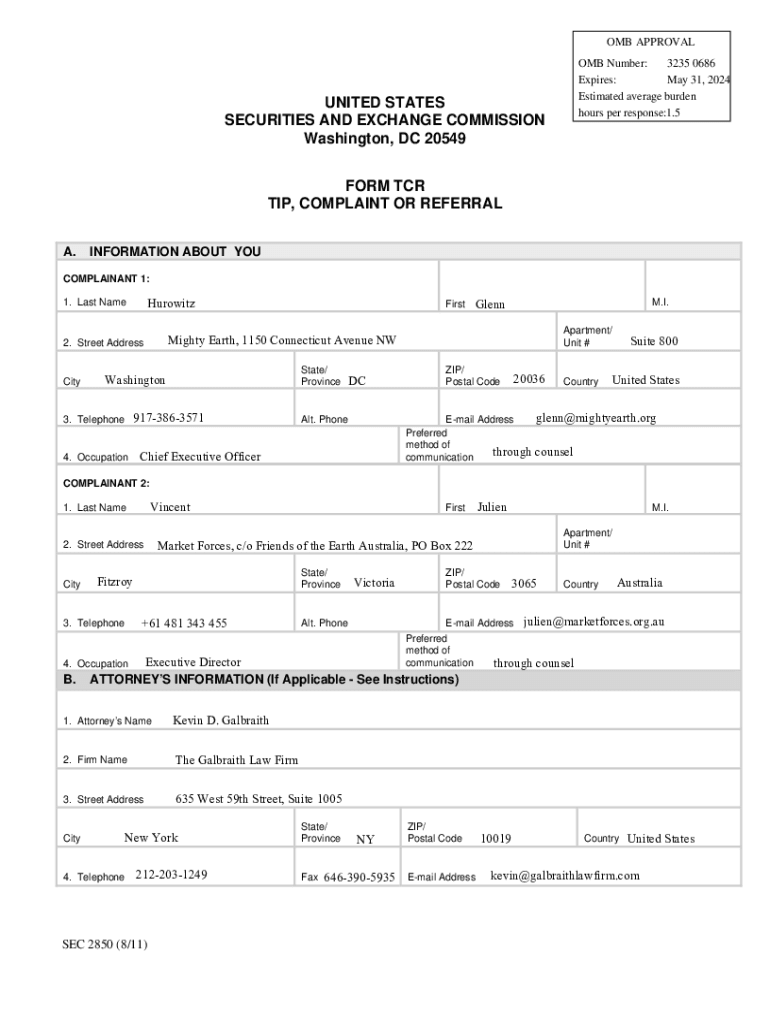 OMB APPROVAL OMB Number: 3235 0686 Expires: May 31, 2024 Estimated average burden hours per response:1.5UNITED STATES SECURITIES AND EXCHANGE COMMISSION Washington, DC 20549 FORM TCR TIP, COMPLAINT
