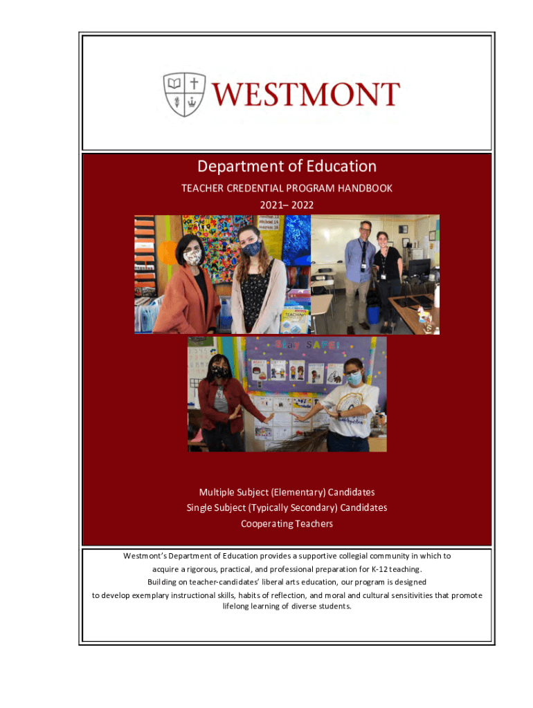 Department of Education TEACHER CREDENTIAL PROGRAM HANDBOOK 2021 2022Multiple Subject (Elementary) Candidates Single Subject (Typically Secondary) Candidates Cooperating Teachers Westmont Department