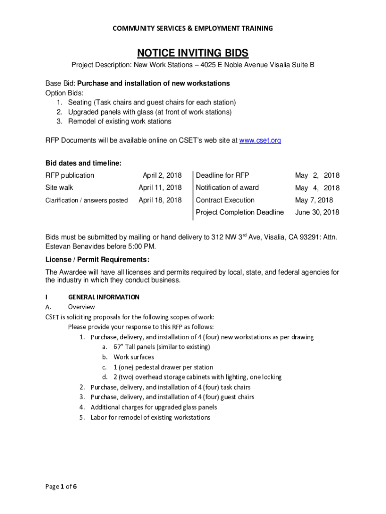 COMMUNITY SERVICES & EMPLOYMENT TRAININGNOTICE INVITING BIDS Project Description: New Work Stations 4025 E Noble Avenue Visalia Suite B Base Bid: Purchase and installation of new workstations Option