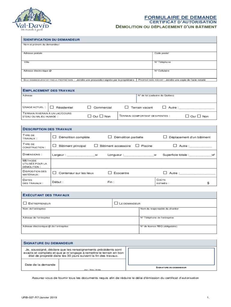 FORMULA IRE DE DEMAND CERTIFICATE DAUTORISATIONDMOLITION OF PLACEMENT DUN RAIMENT IDENTIFICATION DU DEMAND EUR No met prom Du demandeurAdresse postcode postalVilleN TlphoneAdresse Veronique IN Cellulars